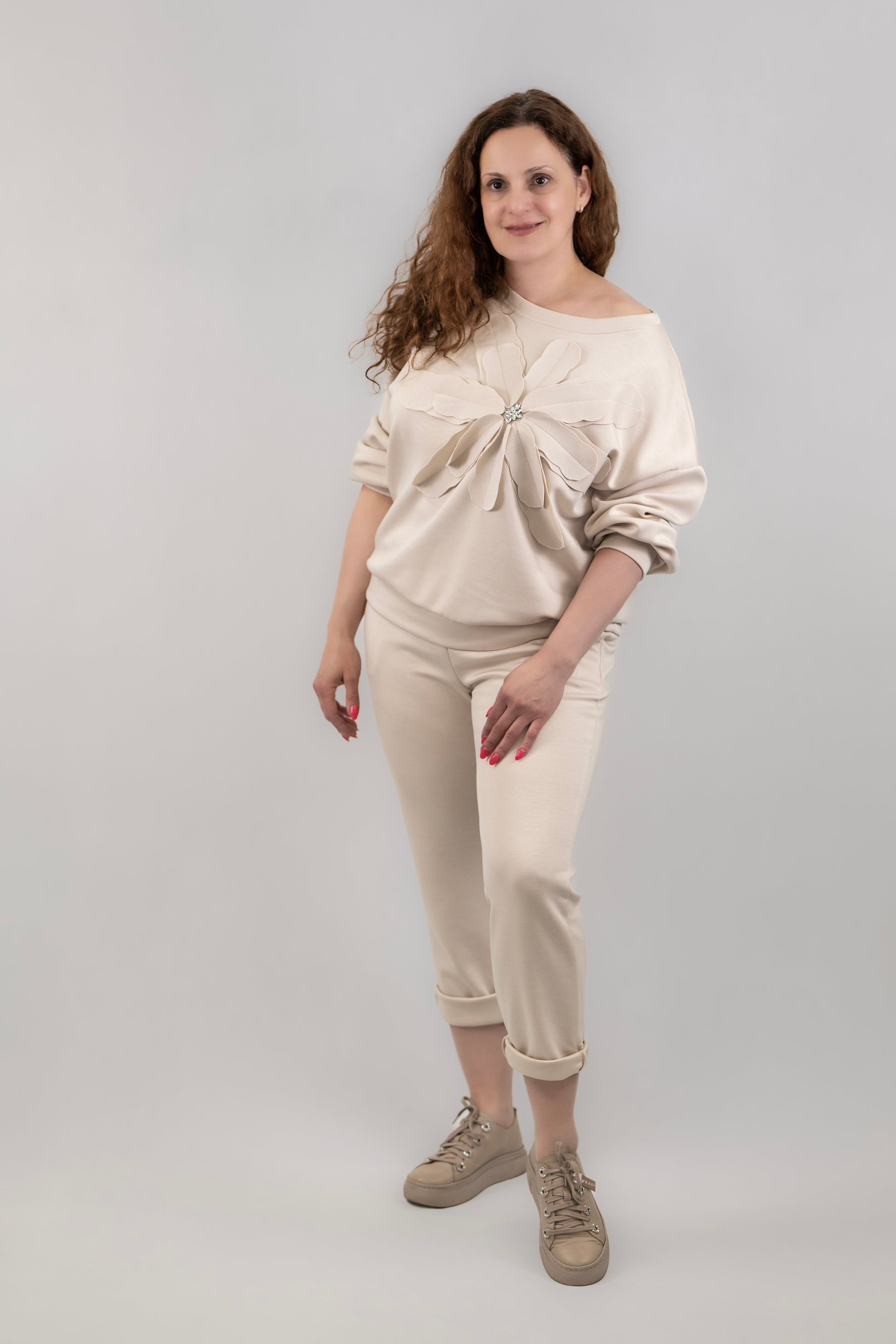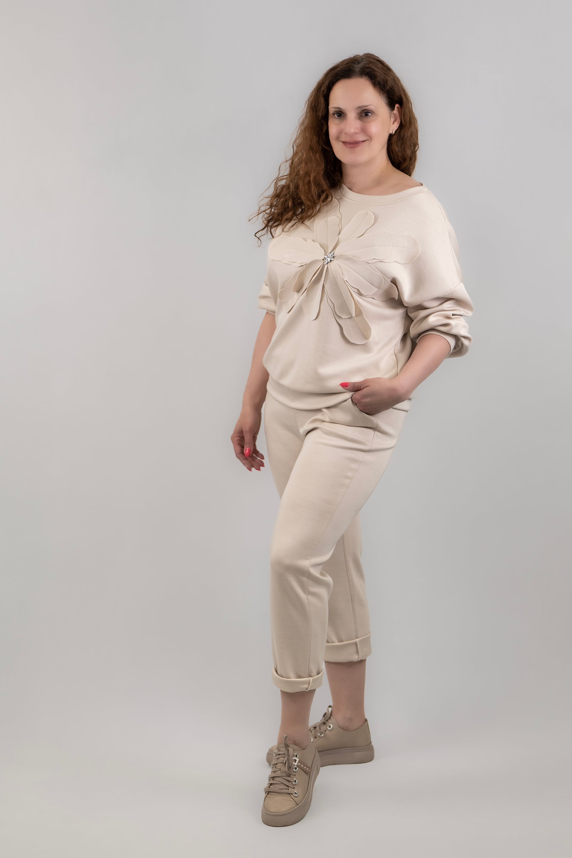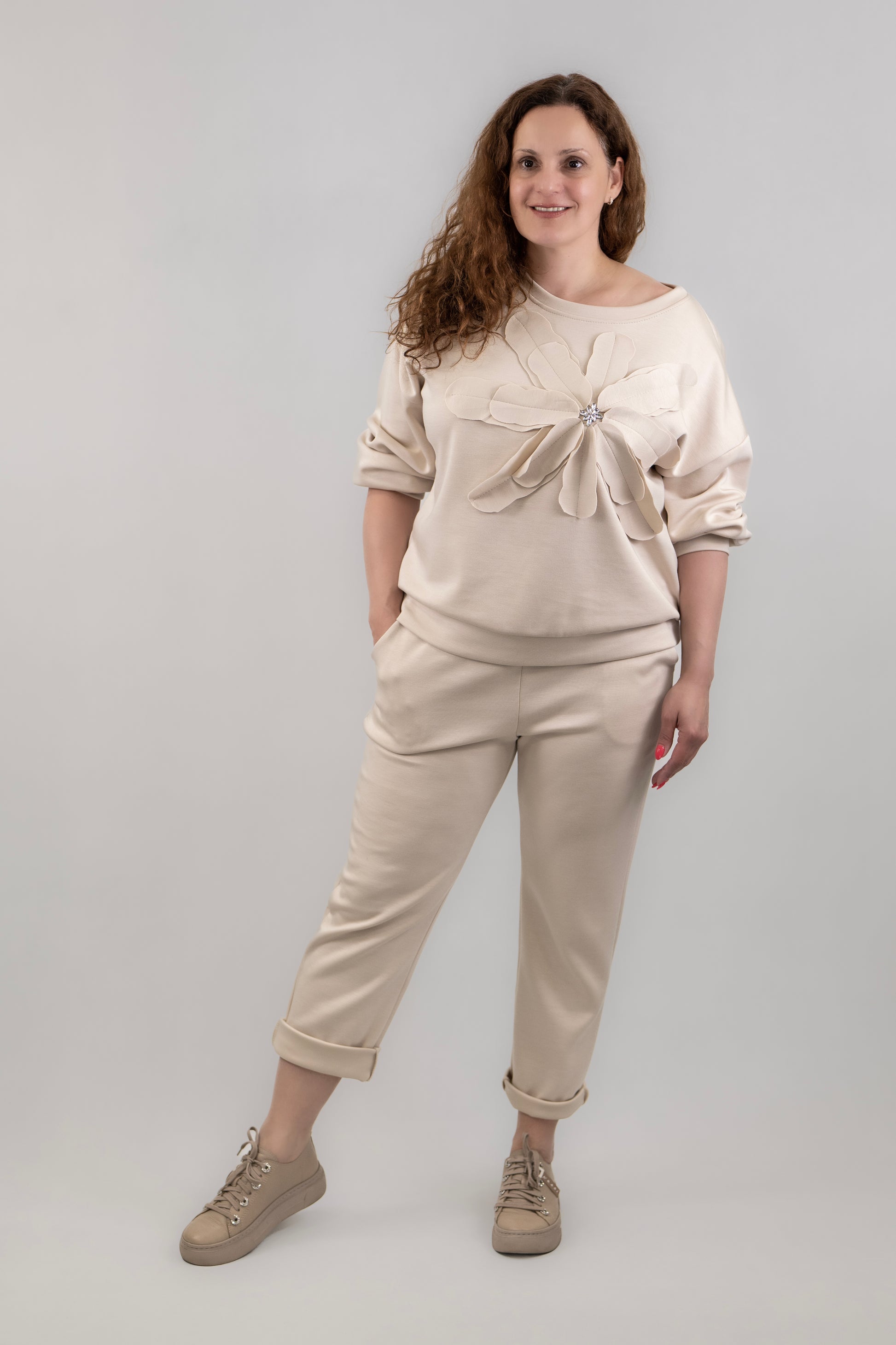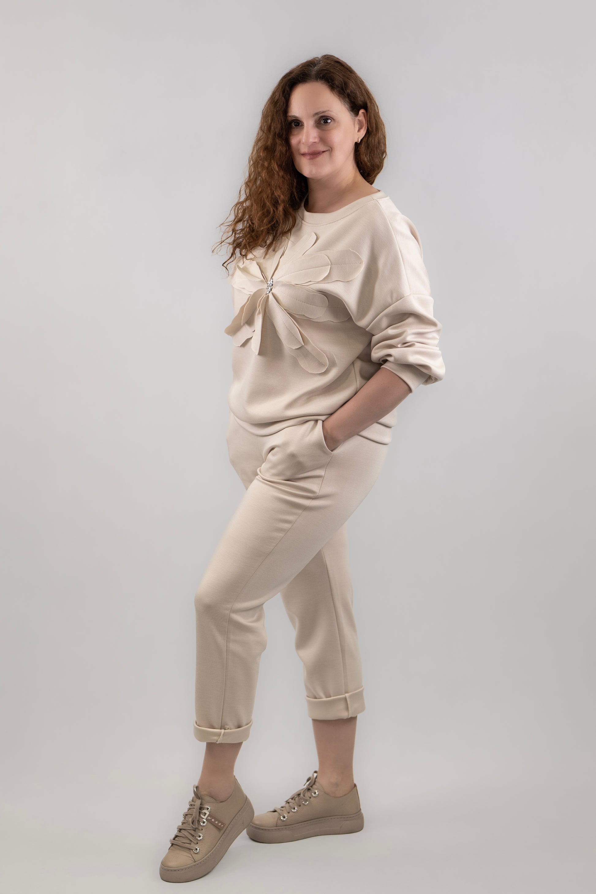 Bézs szabadidőruha a pulóver részén rávarrt virágmintával aminek a közepét rávarrt kövek díszítenek. A nadrág laza fazonú alak követő. Egyméretes S-XL méretig ajánljuk.
