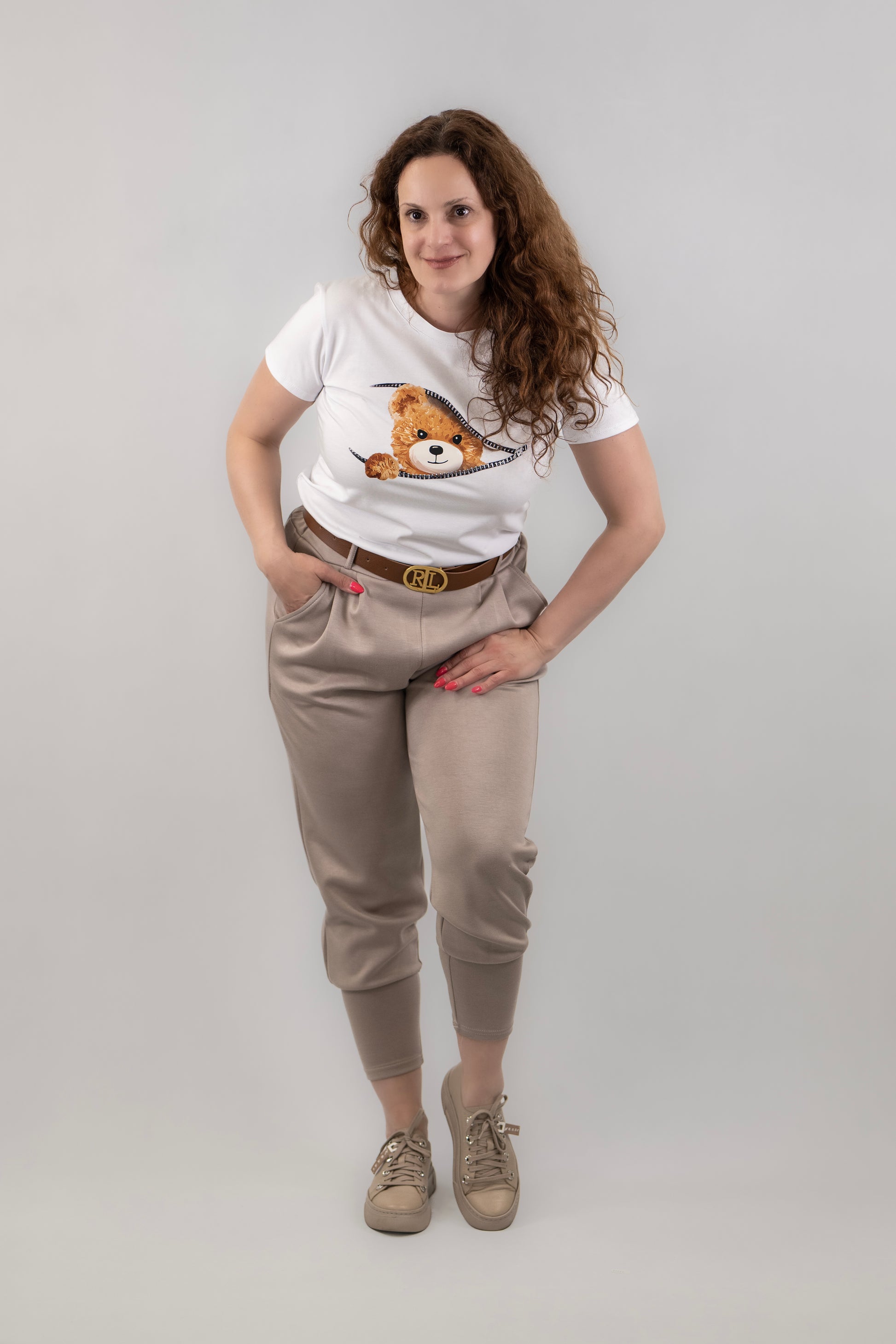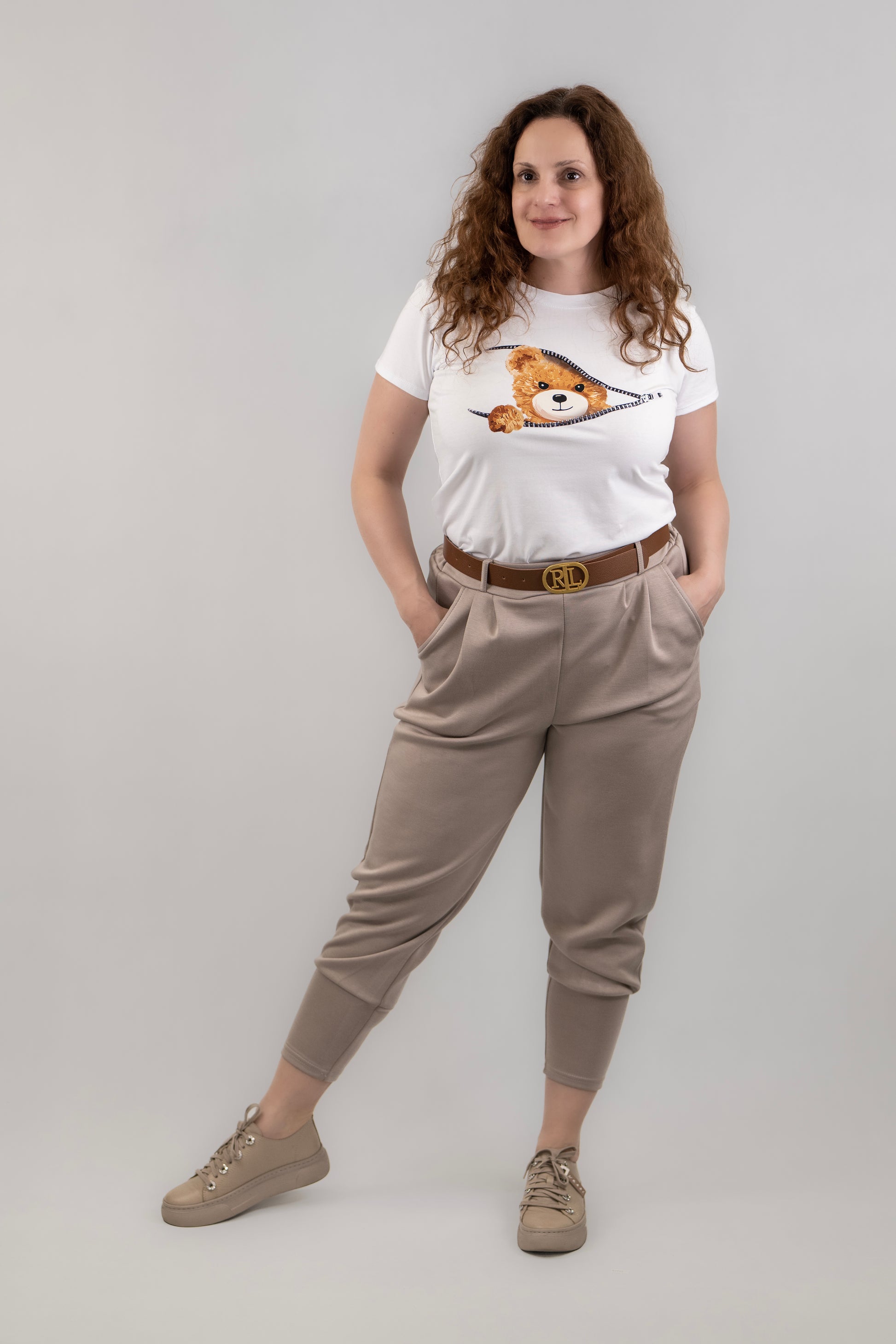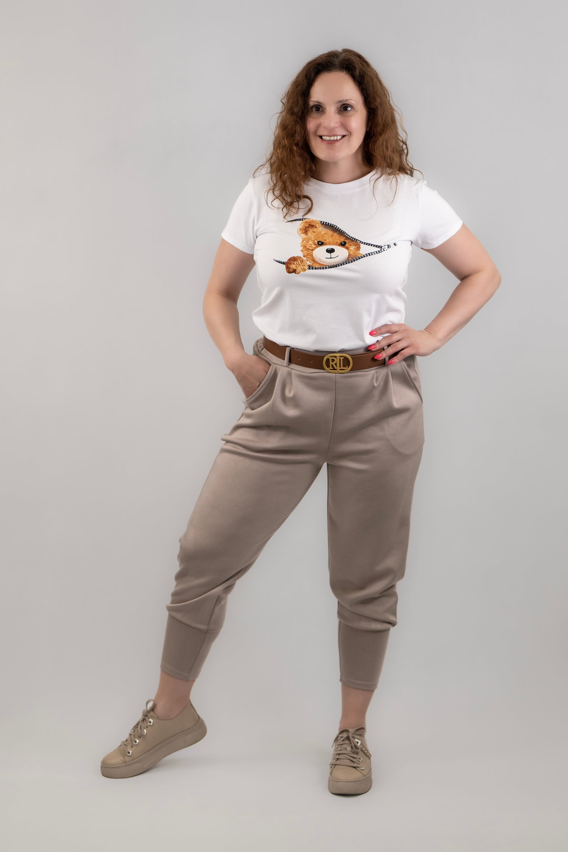 Világos barna puha kényelmes nadrág, övvel. Nadrág száránál alul passzé résszel.