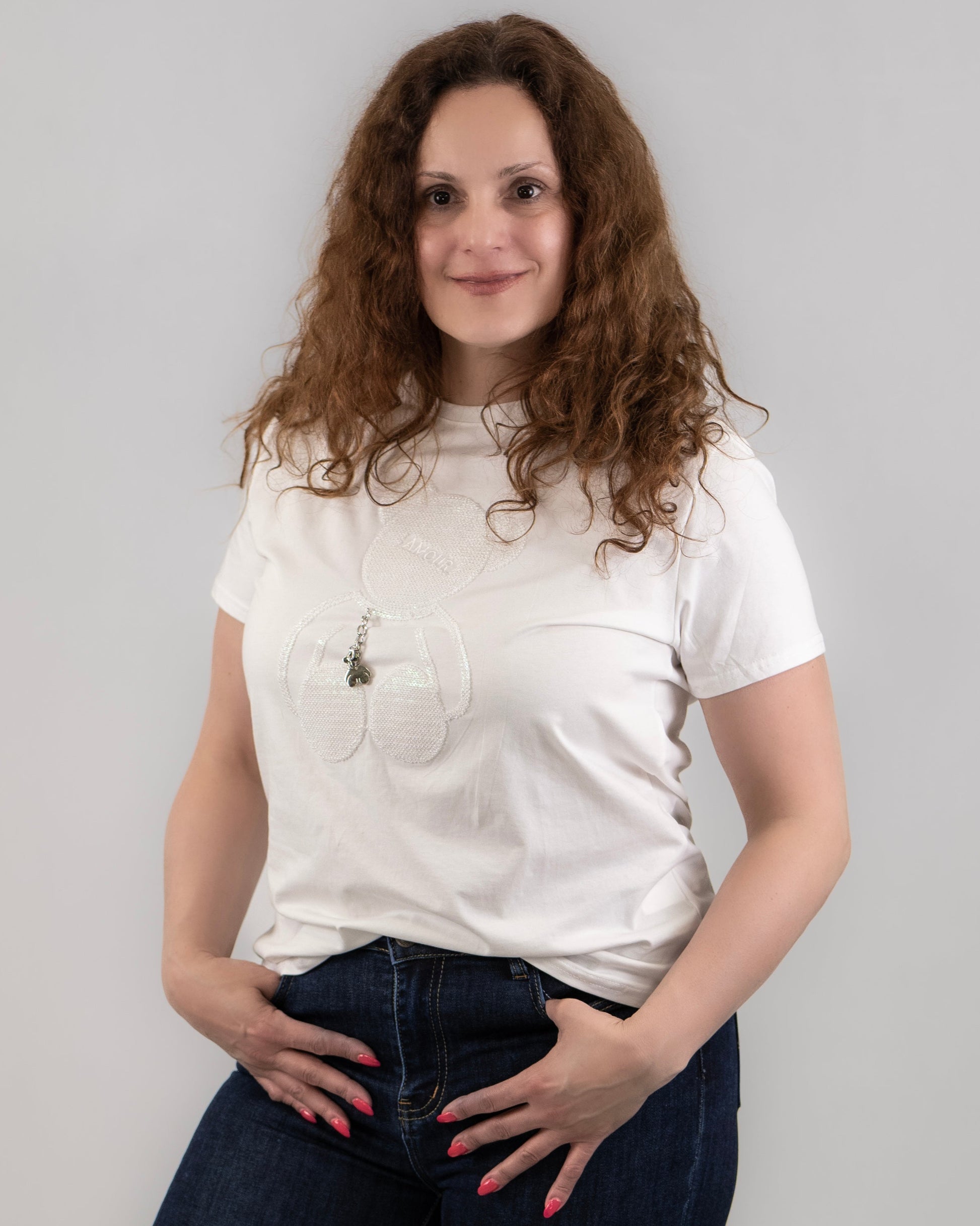 Fehér rövid ujjú felső rávarrt csillogó maci mintával. Kényelmes pamut felső.