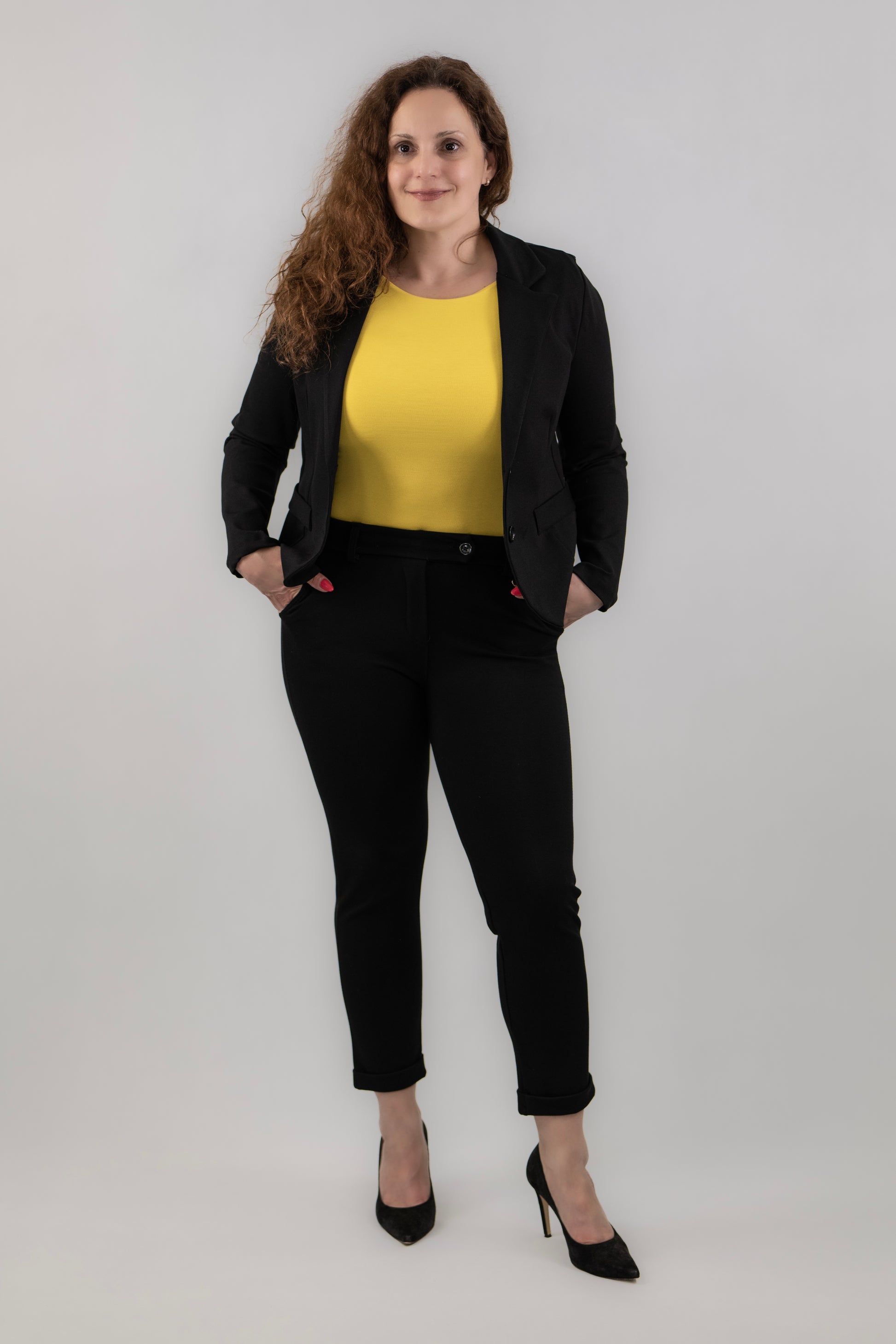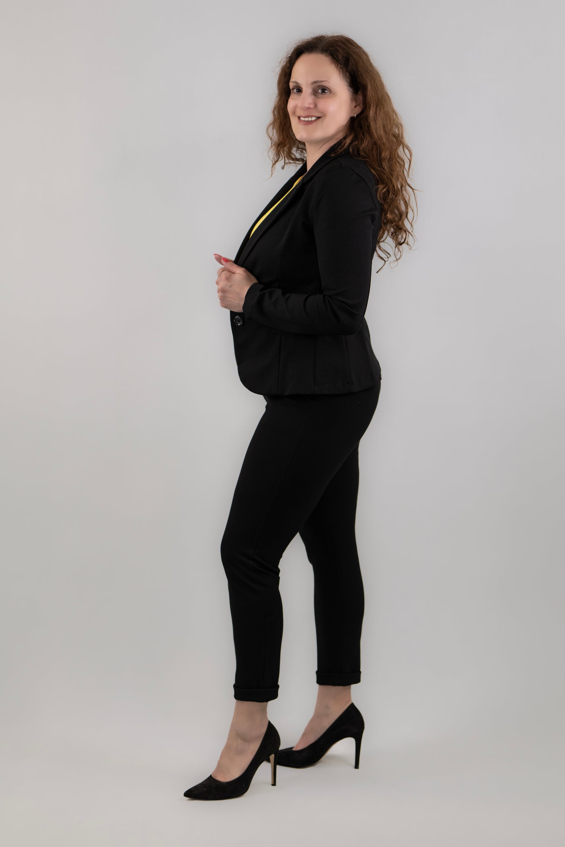 Fekete béleletlen rugalmas anyagú blézer kettő gombbal. Karcsúsított fazon elől díszzsebekkel.