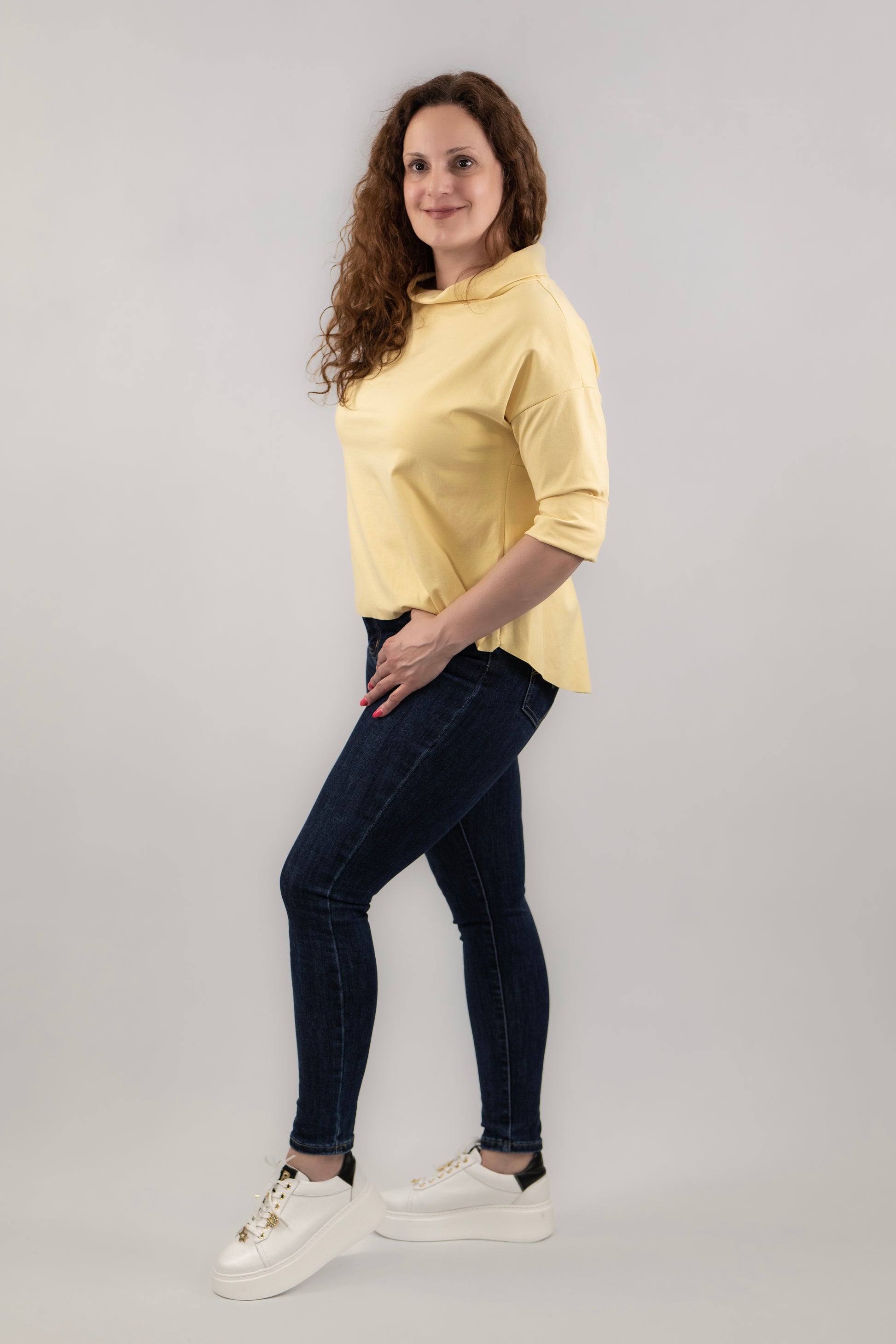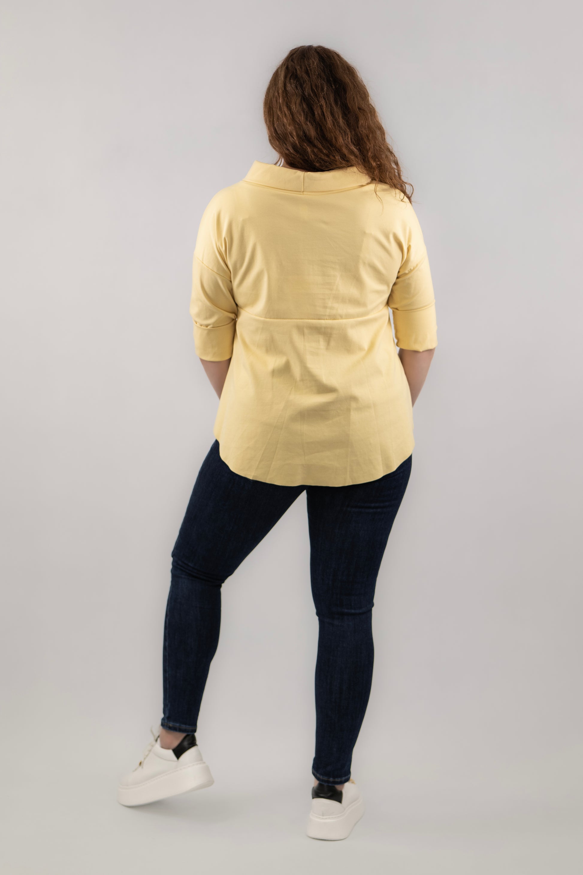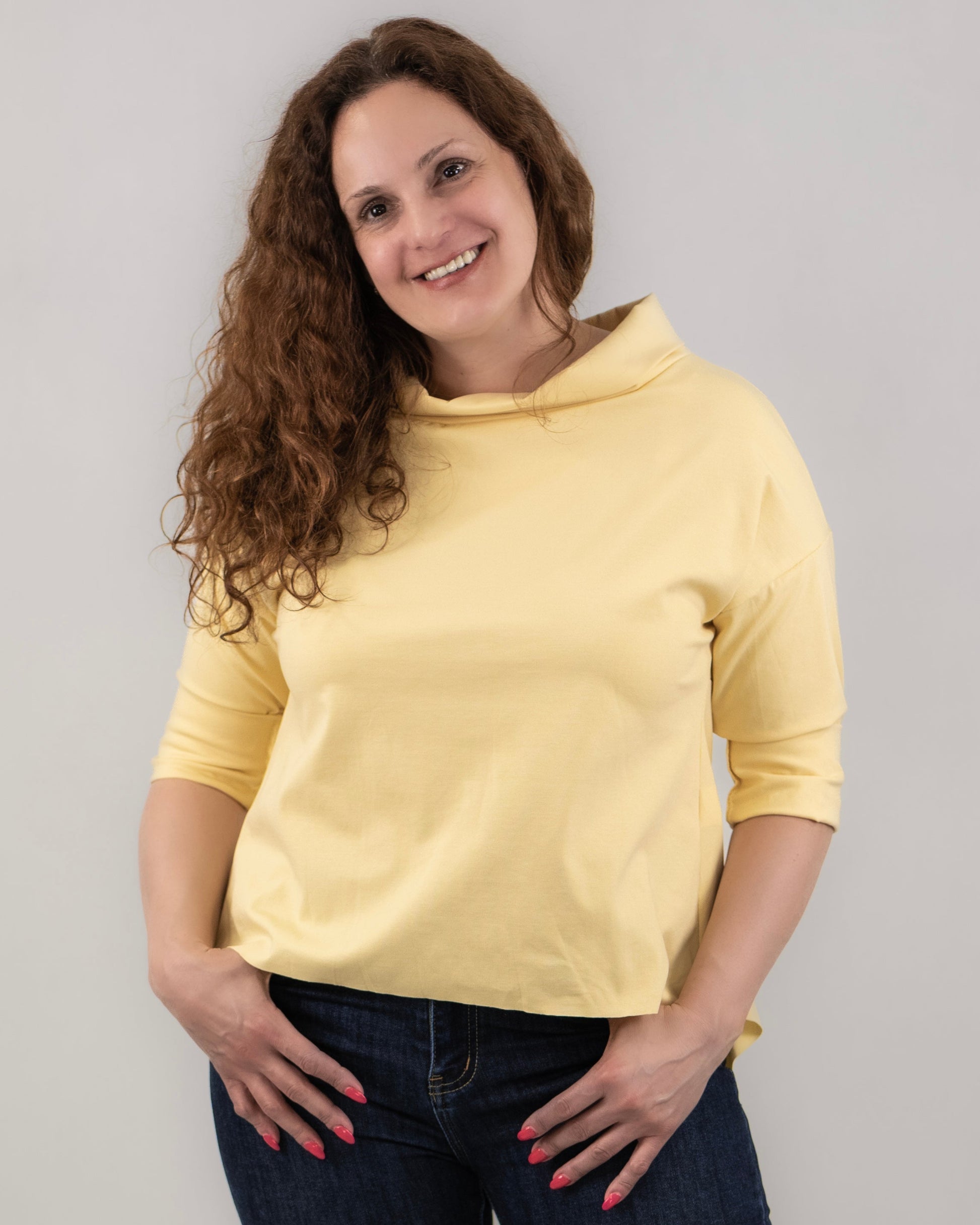 Pasztell színű felső, ejtett vállal. Eleje rövidebb a háta hosszabb.