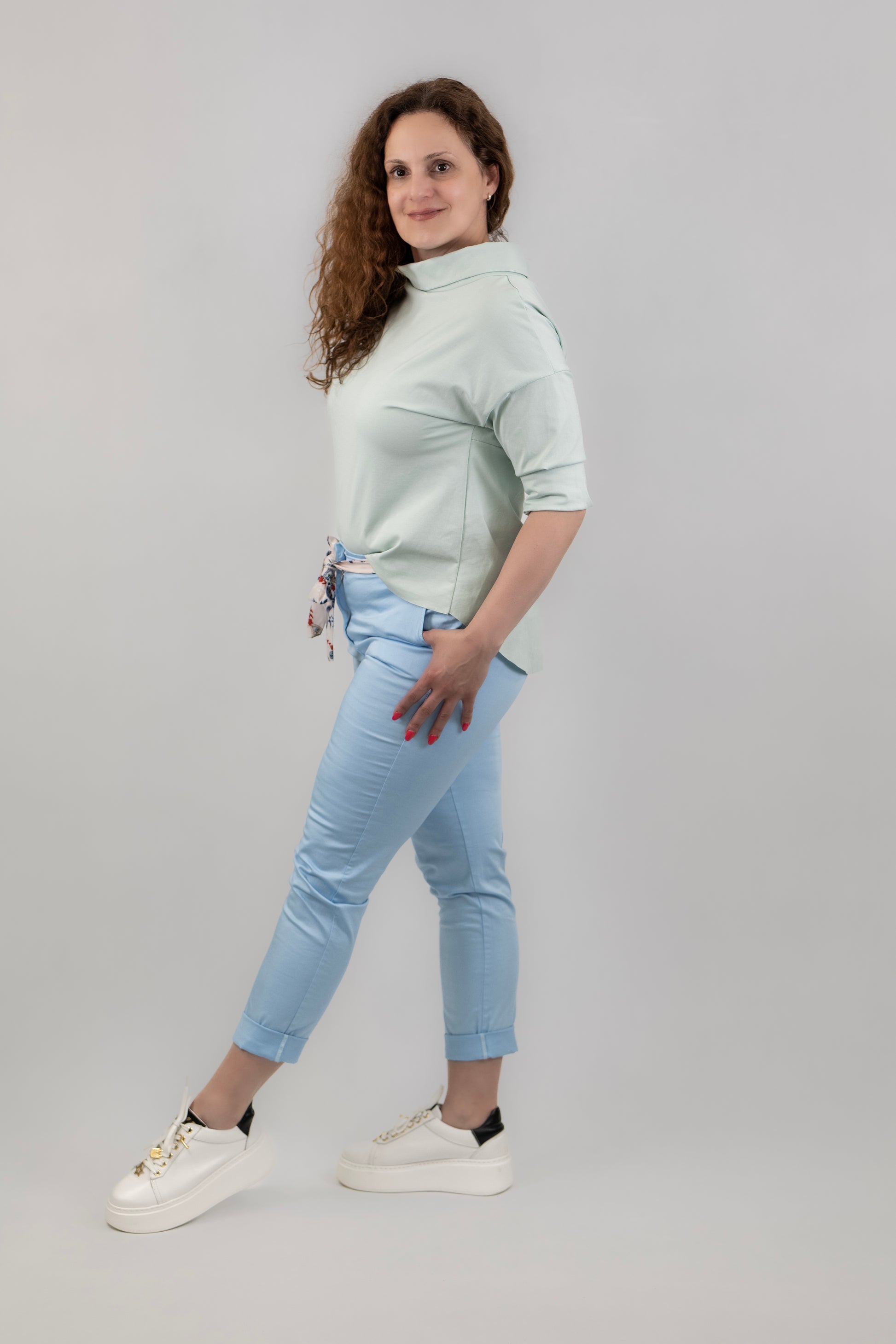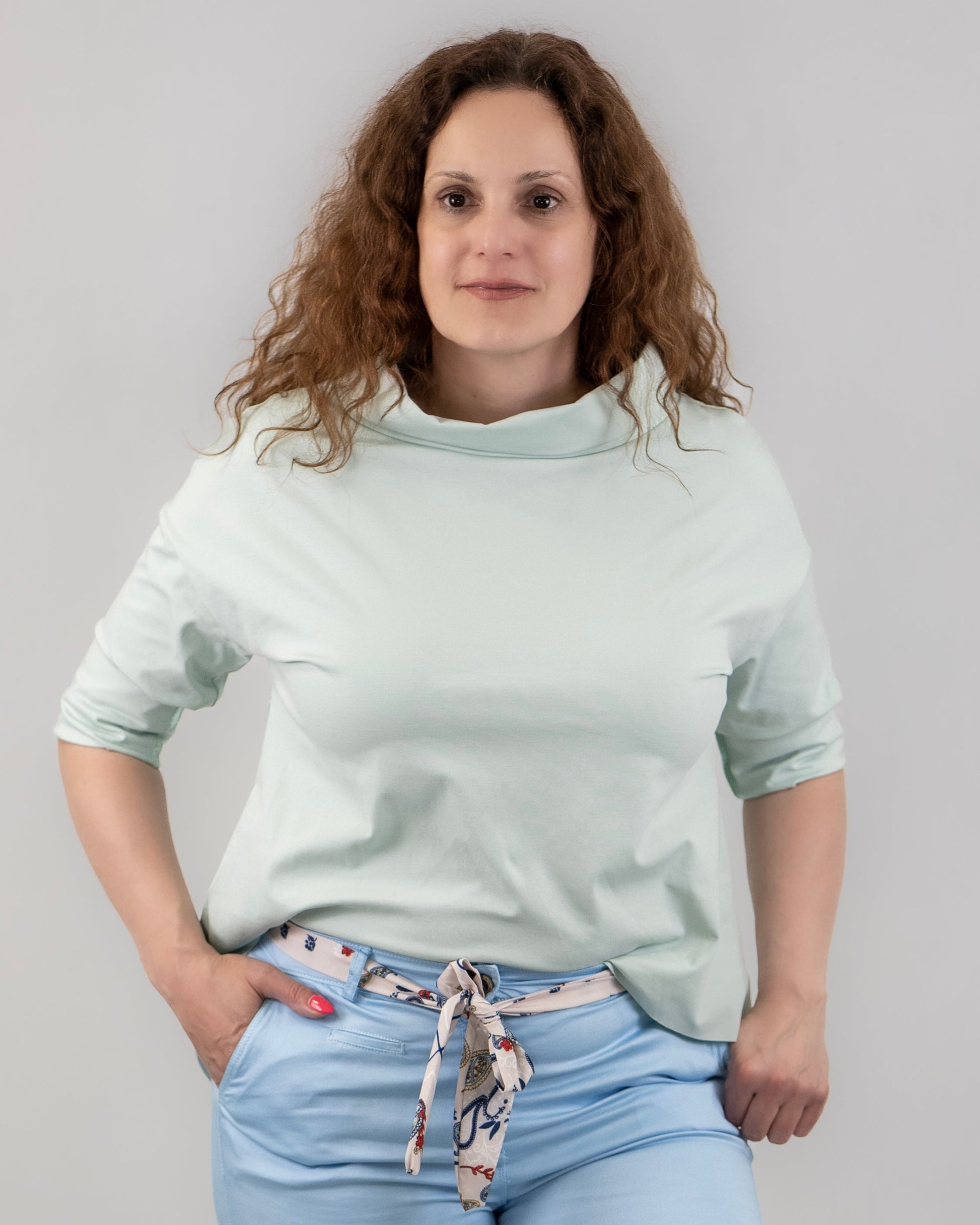 Pasztell színű felső, ejtett vállal. Eleje rövidebb a háta hosszabb.