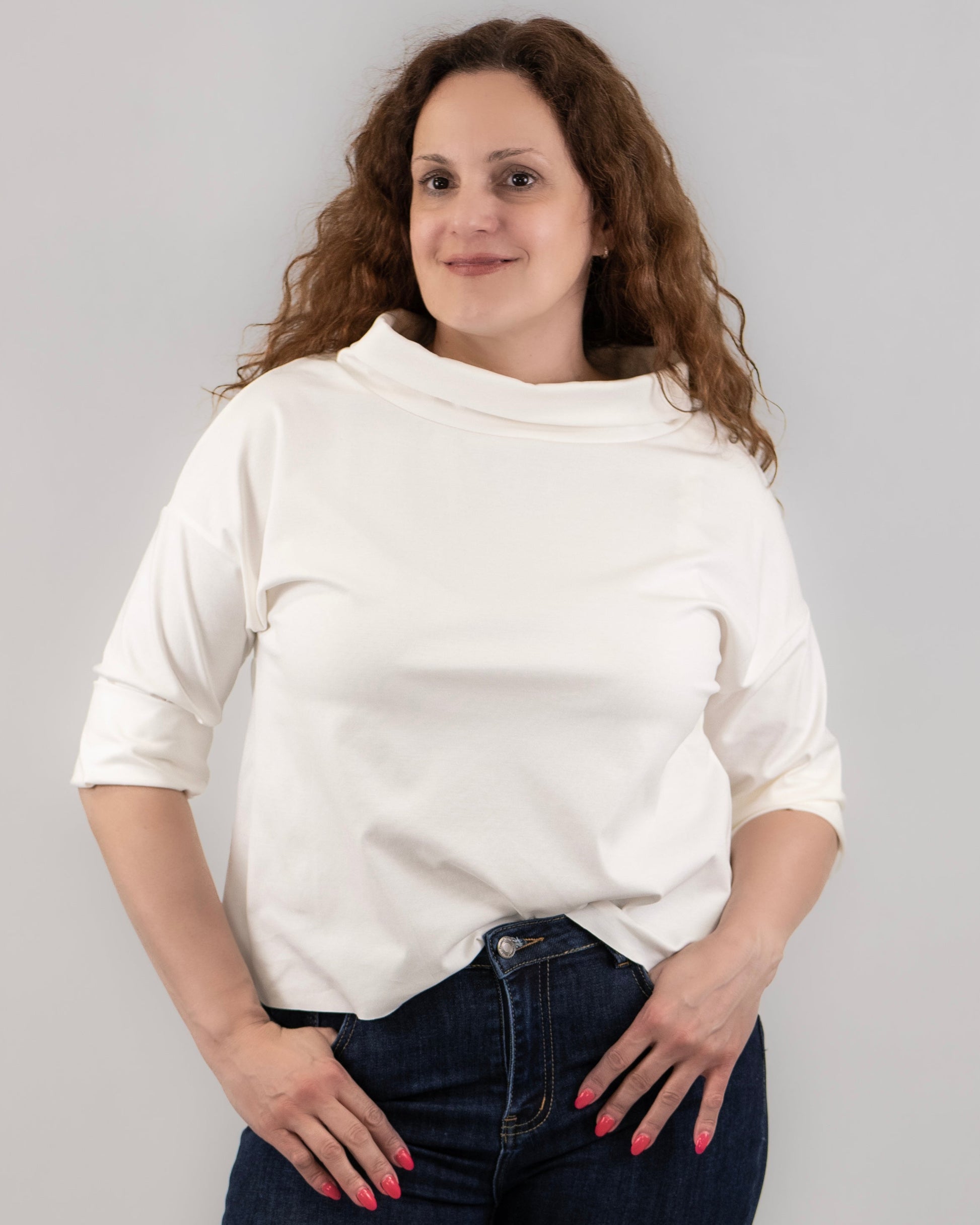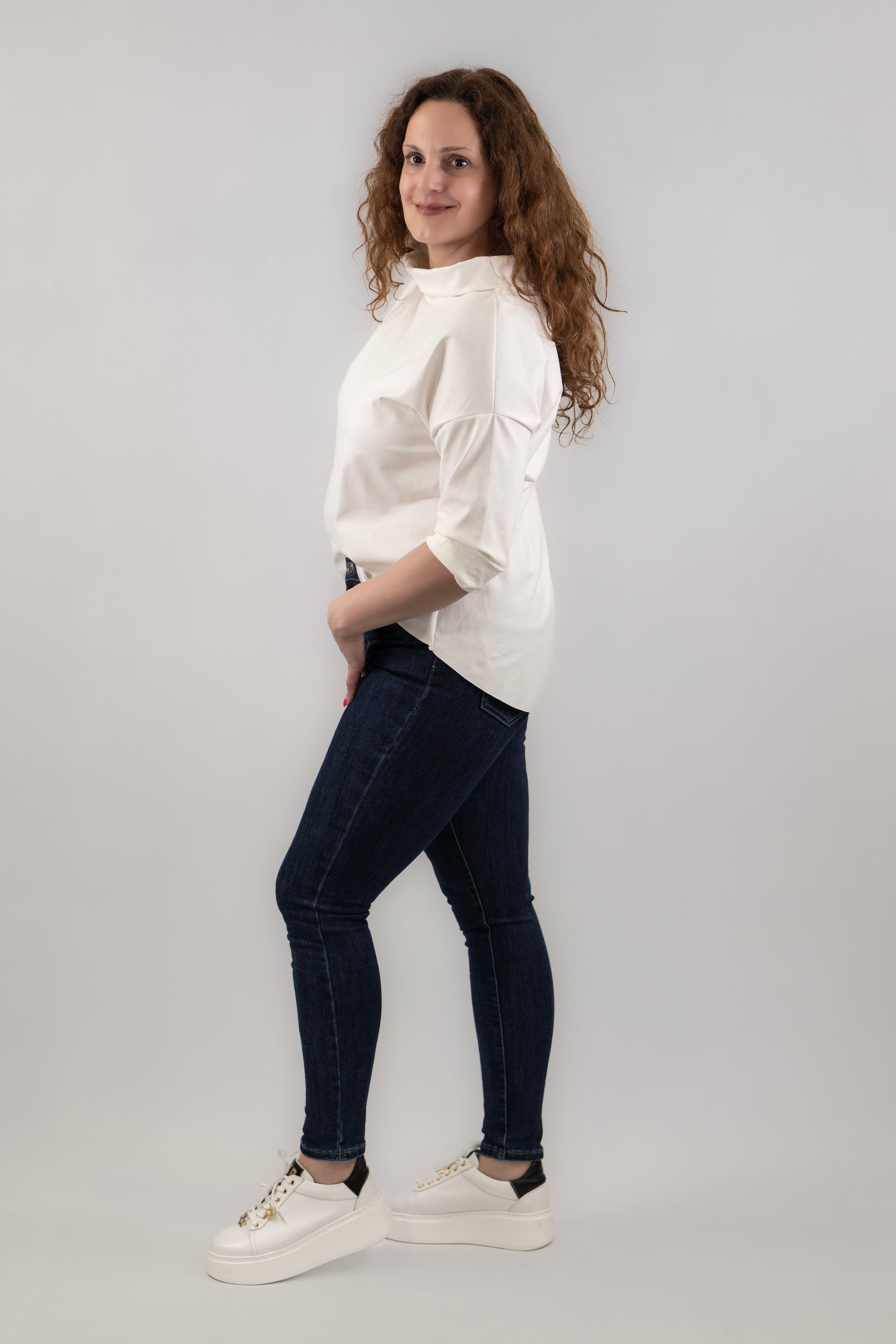 Fehér színű felső, ejtett vállal. Eleje rövidebb a háta hosszabb.