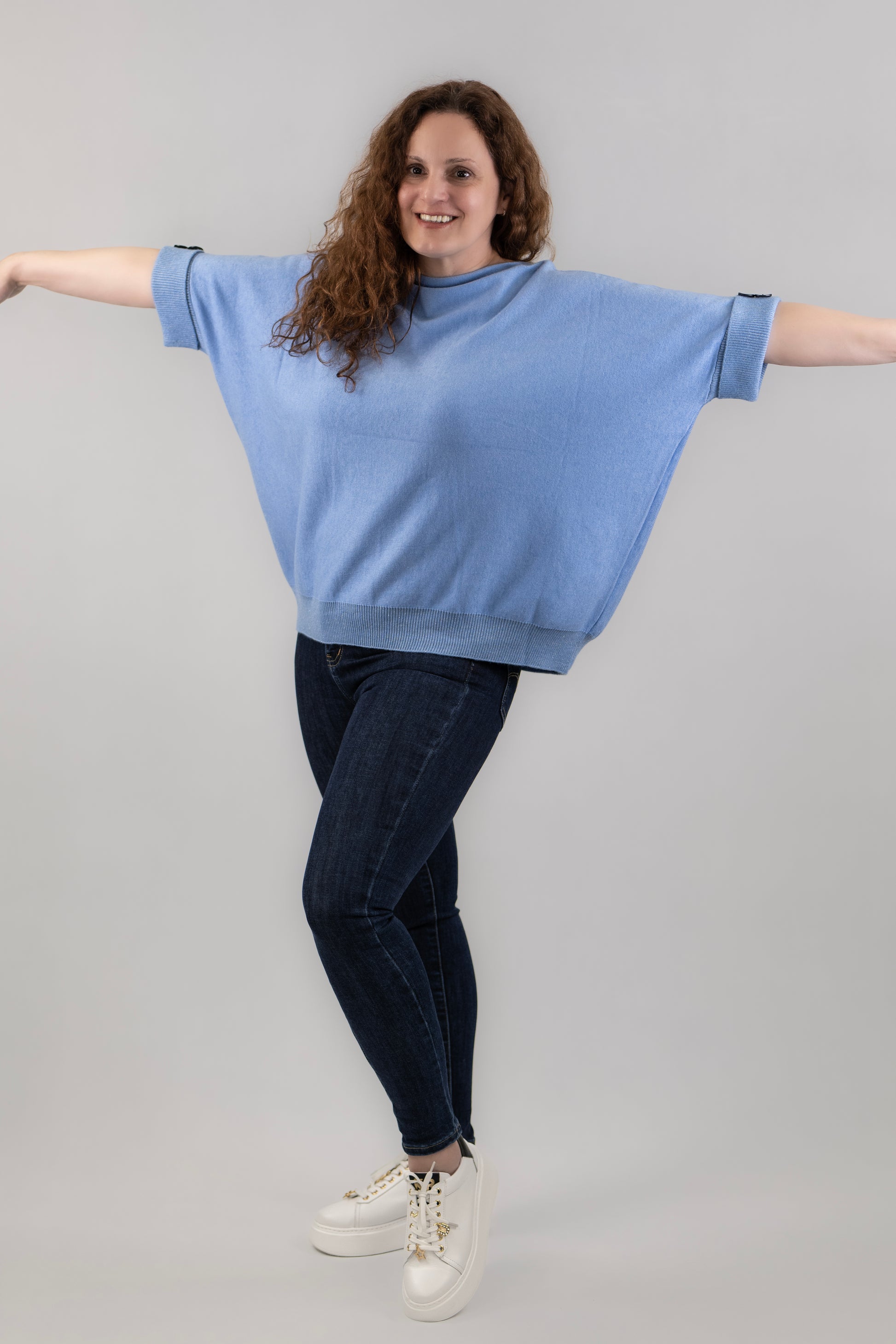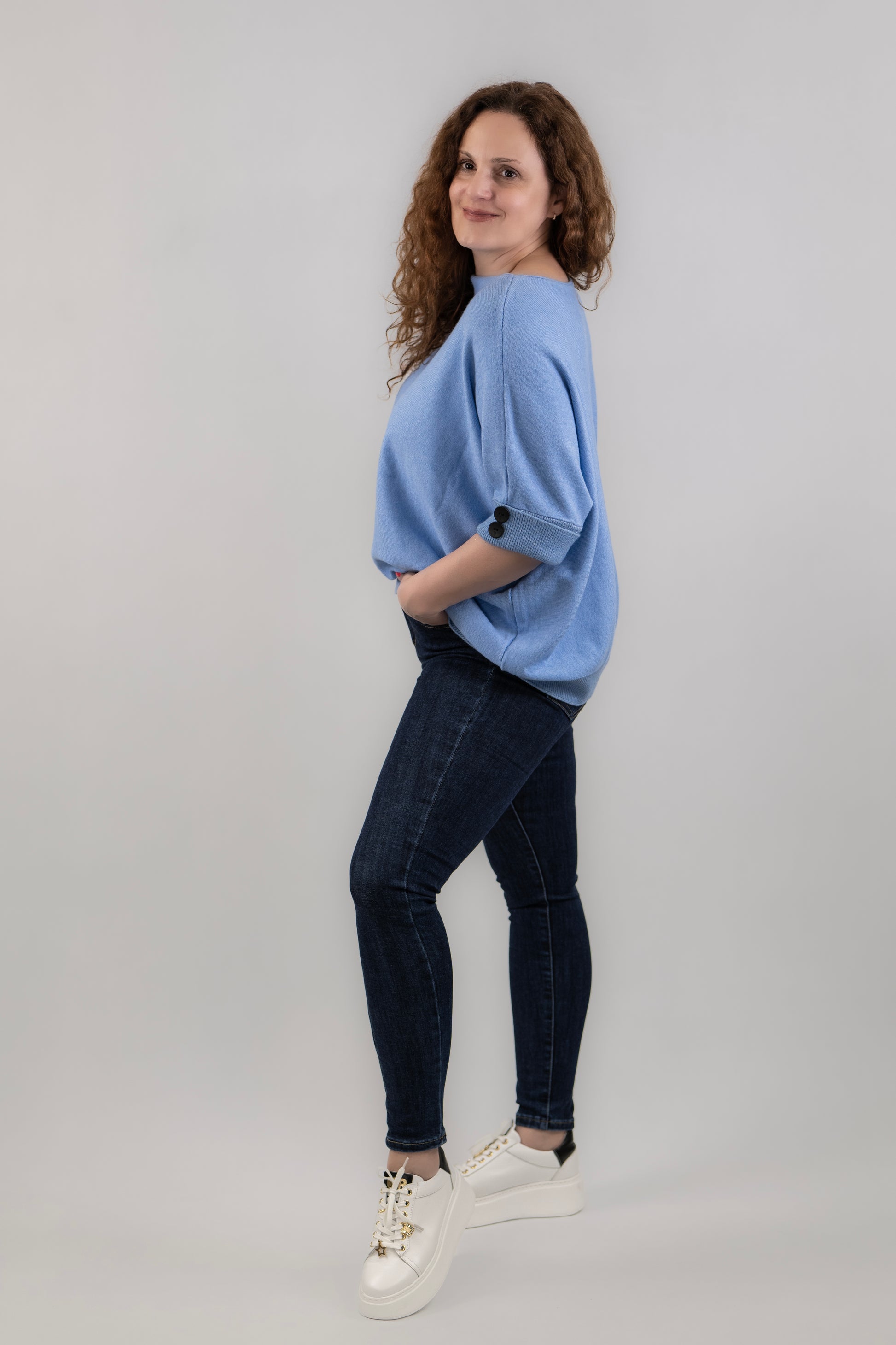 Denevér ujjú pulóver. Nagy méretű, kellemes puha anyagú. Alul a passzé résznél arany szállal átszőtt.