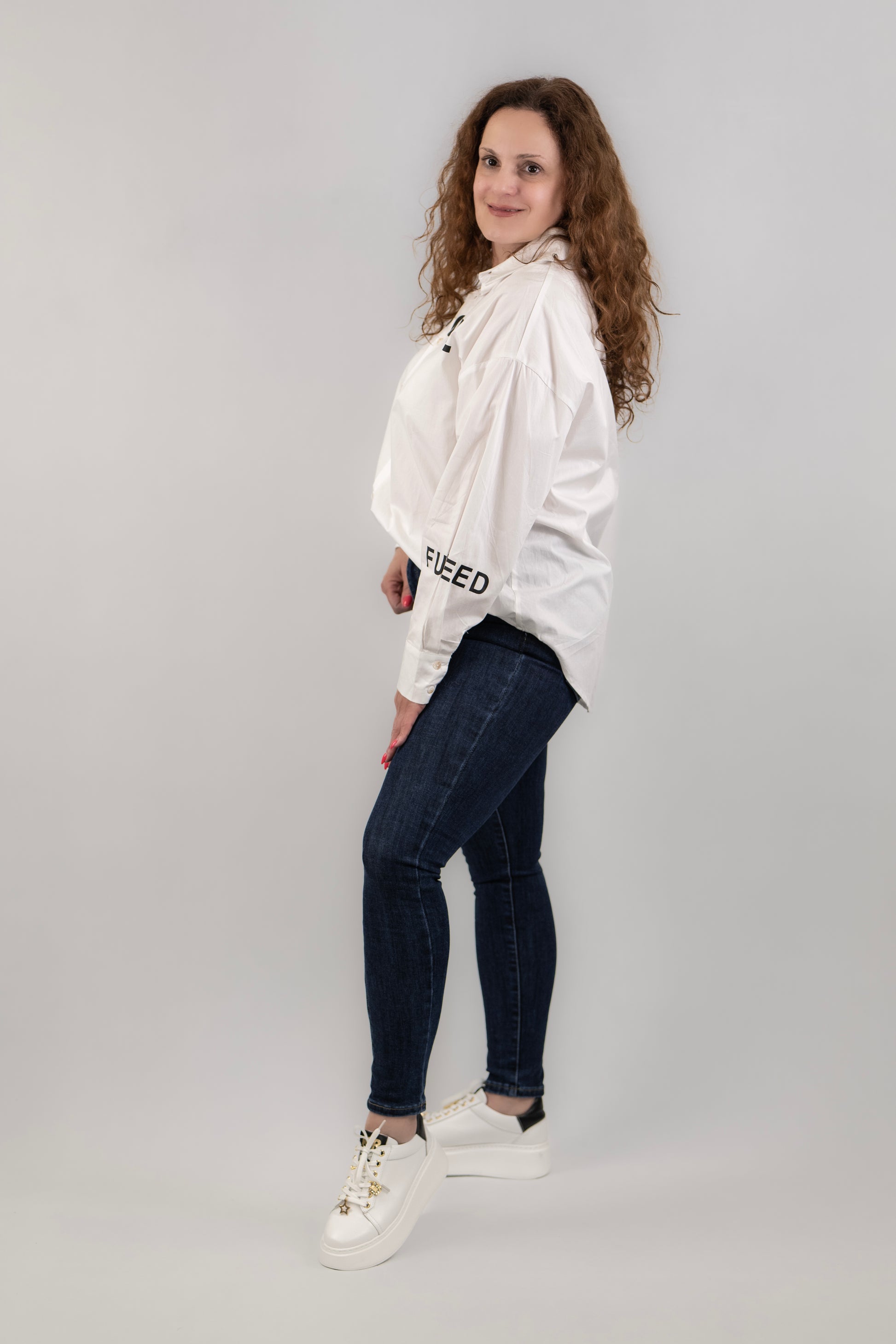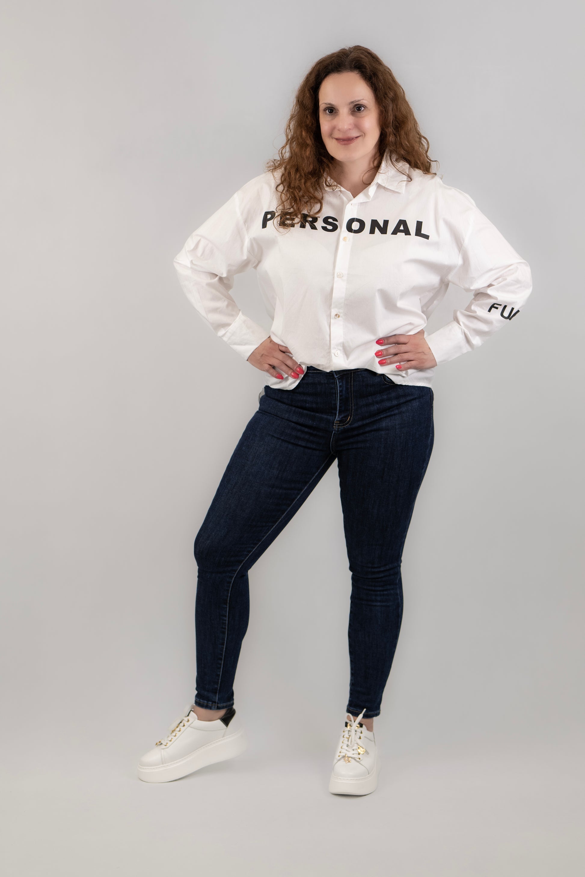 Fehér hosszú ujjú ing, rávasalt fekete PERSONAL felirattal az elején és bal alkarján FUSEED felirattal. Elől rövidebb hátul hosszabb laza fazon.