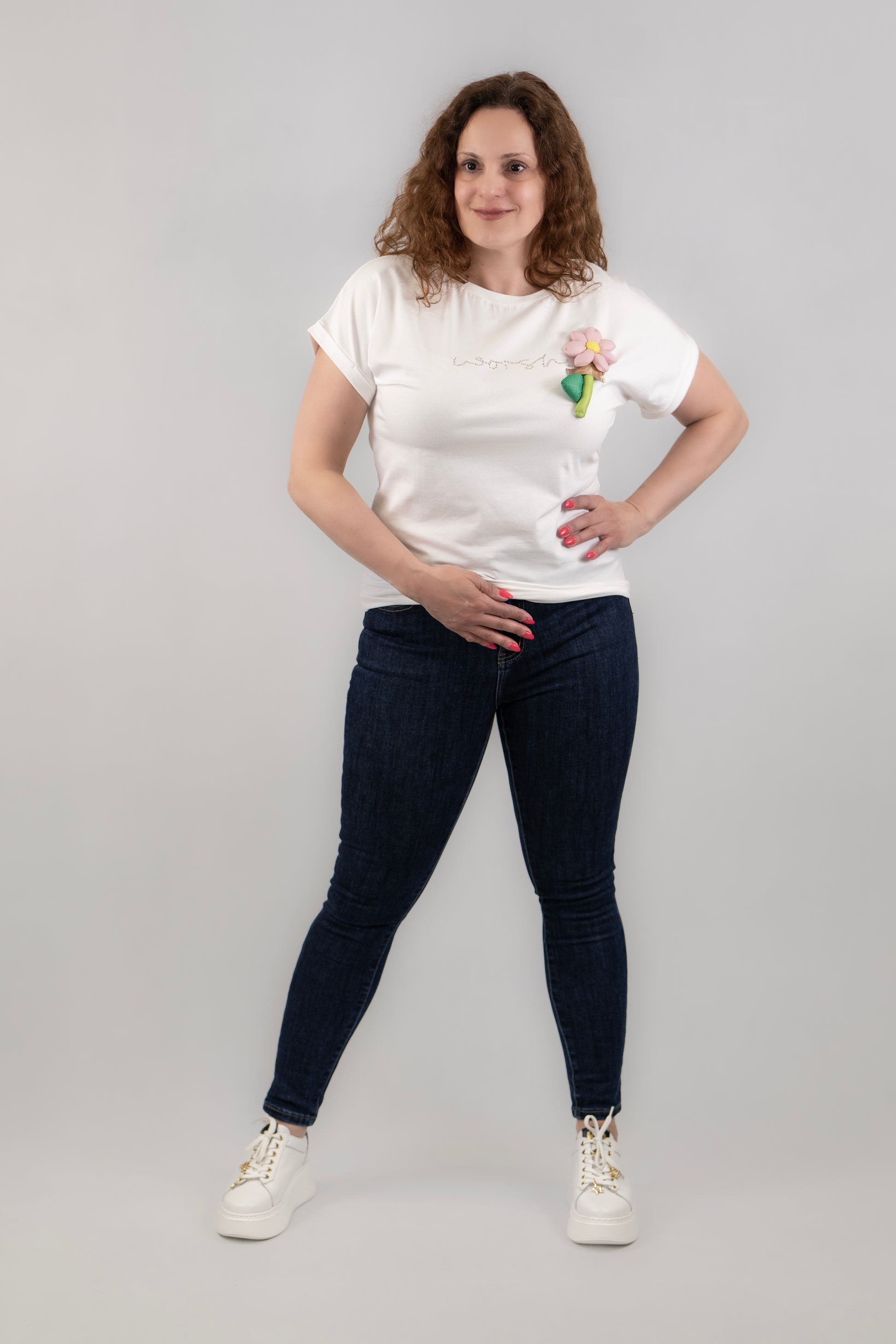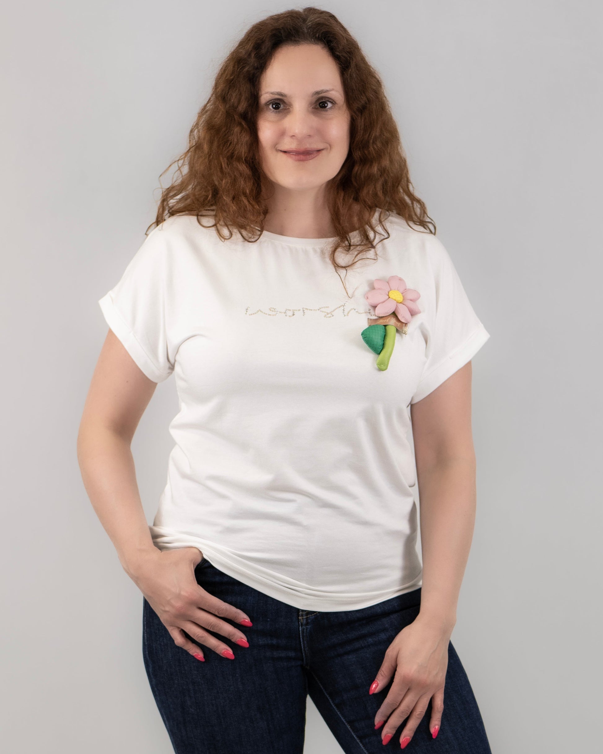 Fehér rövid ujjú felső 3 D-és rávarrt virág mintával.
