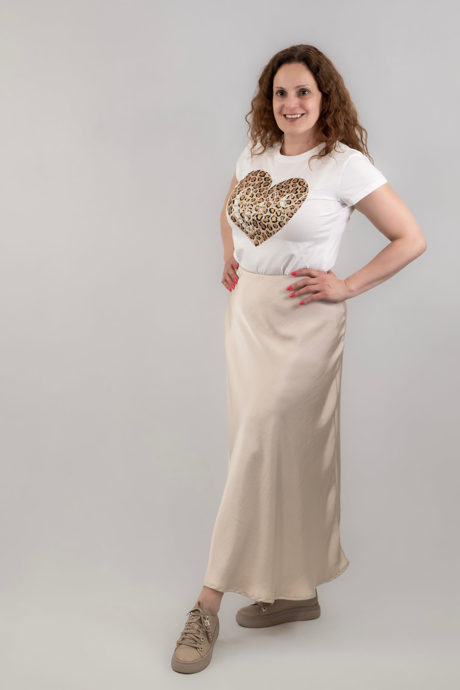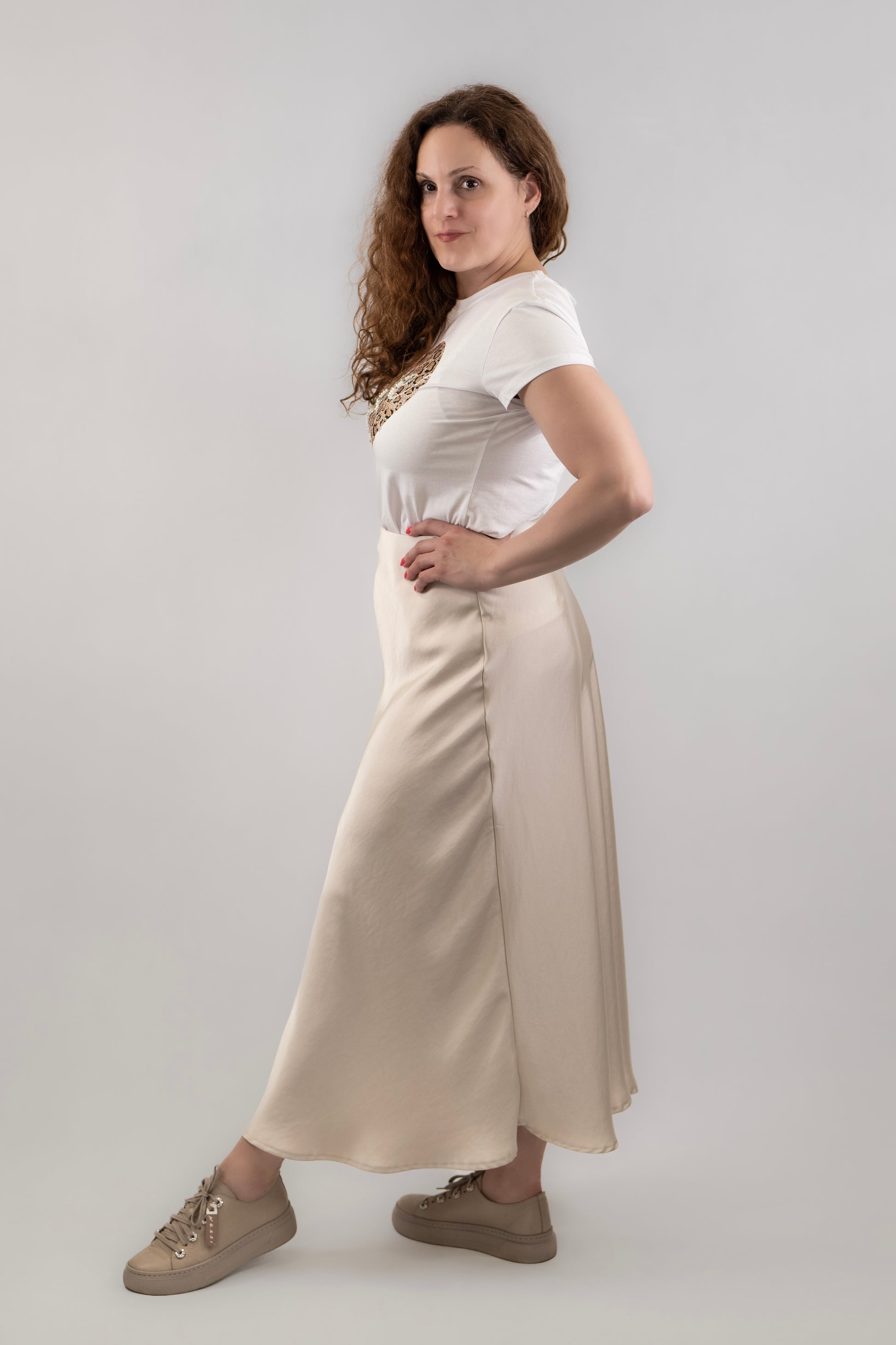Enyhén harangszabású szoknya fényes bézs színű. Gumírozott derékrész a csípőnél teszthez álló fazon. Egyméretes S-L méretig ajánljuk.