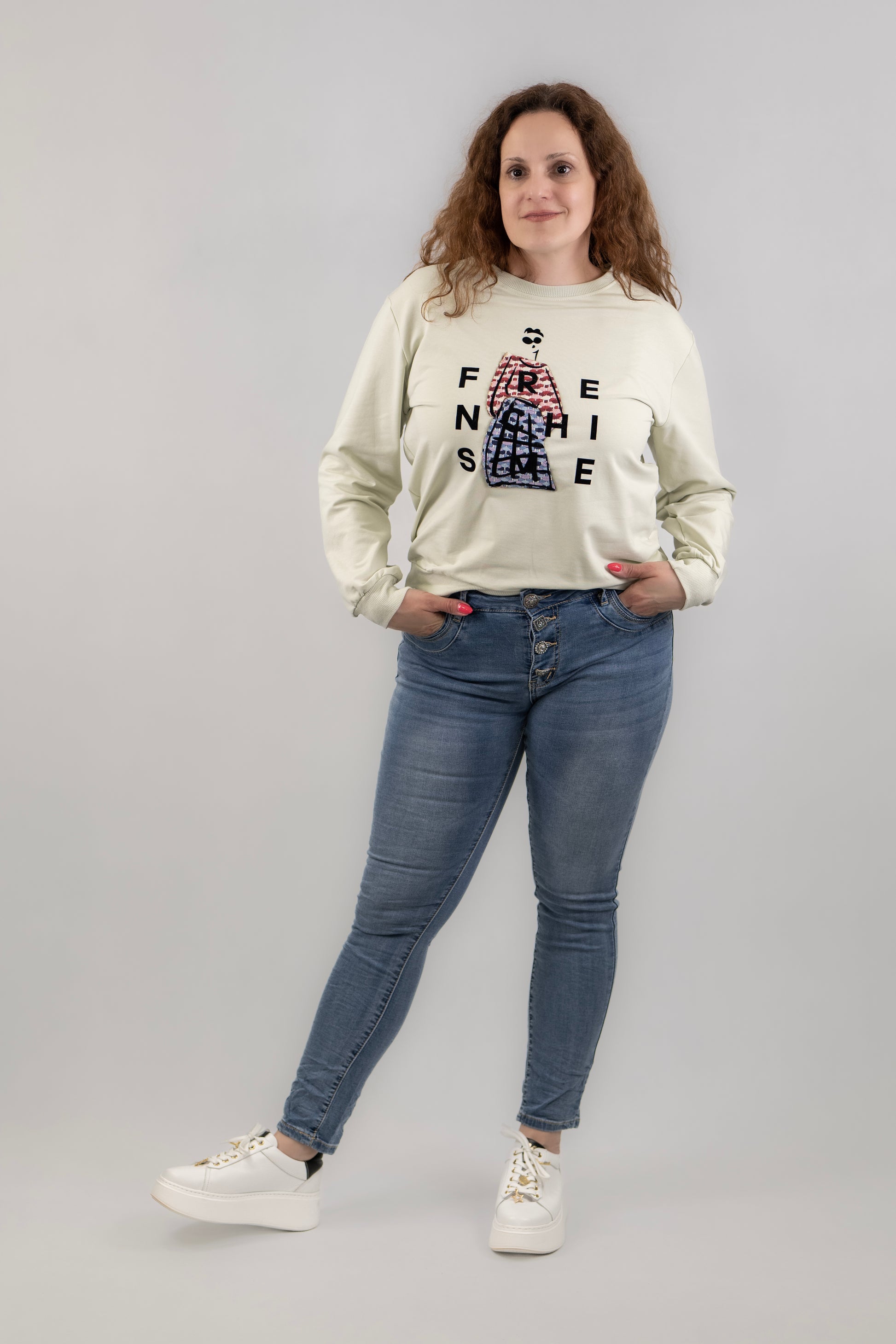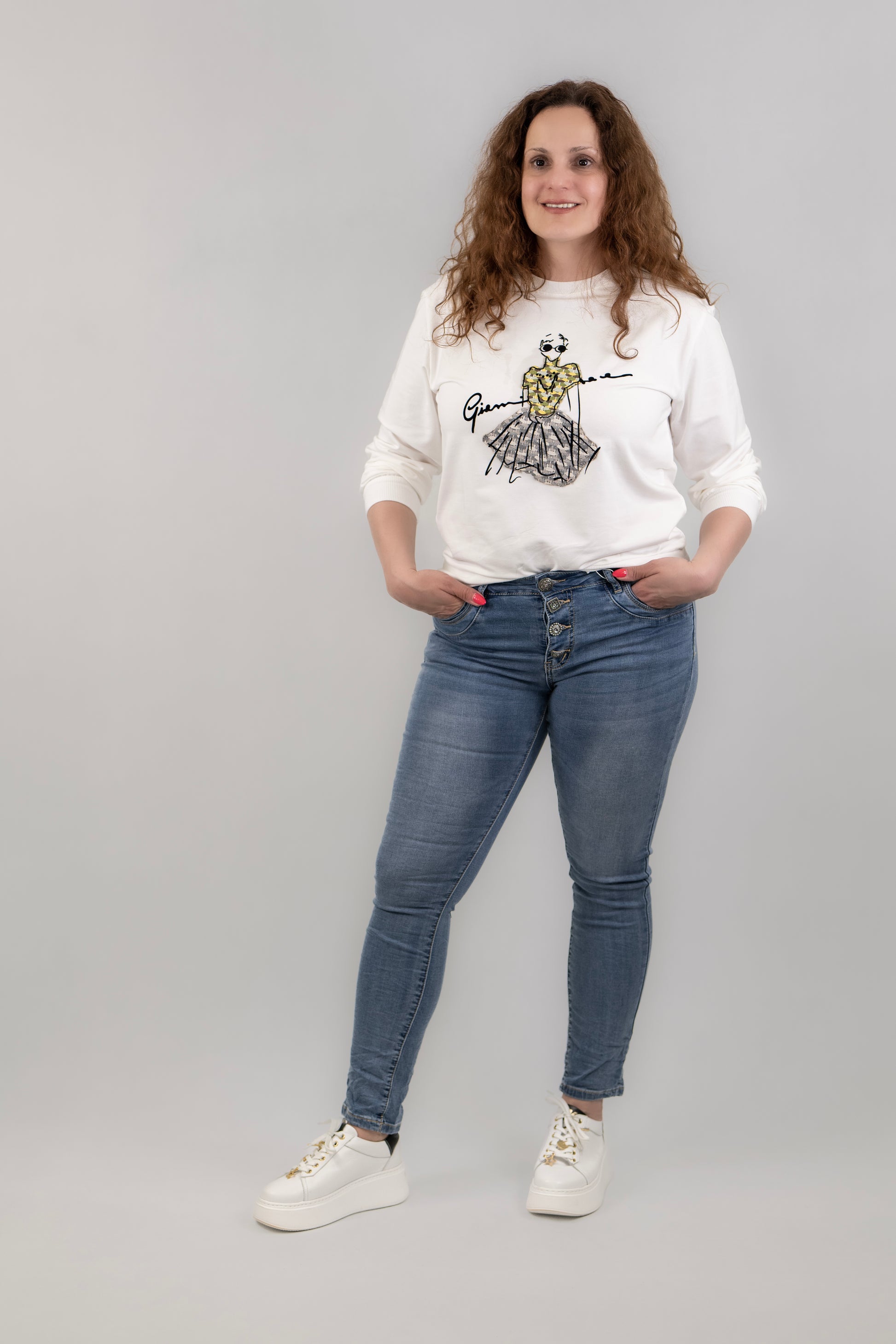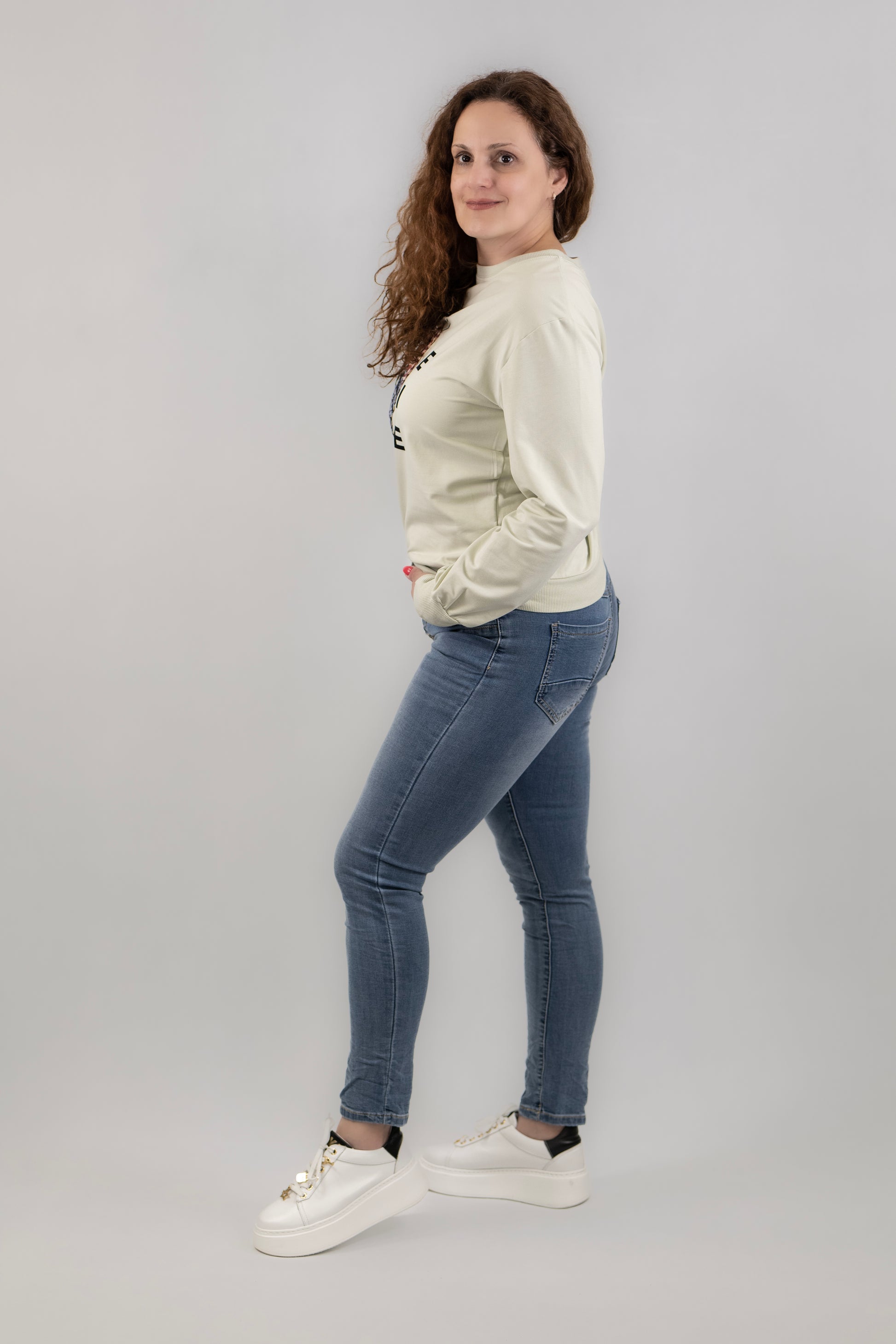 A fotón Anett szerepel 166 cm magas és 70 kg. M méretet visel.